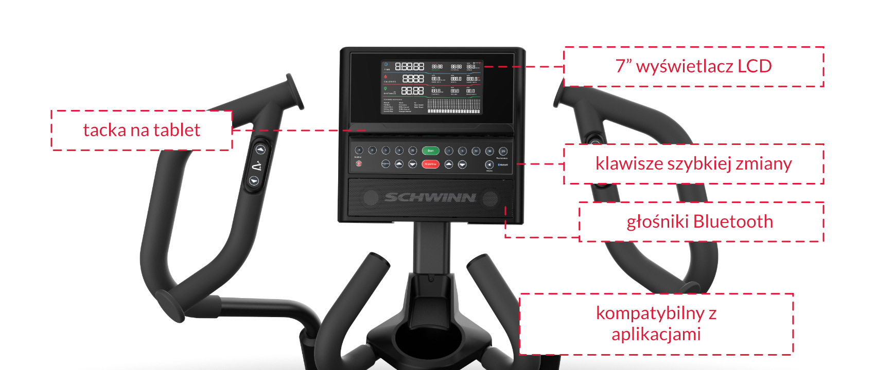 • Wyświetlacz: 7" wysokiej rozdzielczości wyświetlacz LCD pozwalają na śledzenie i kontrolowanie parametrów treningu