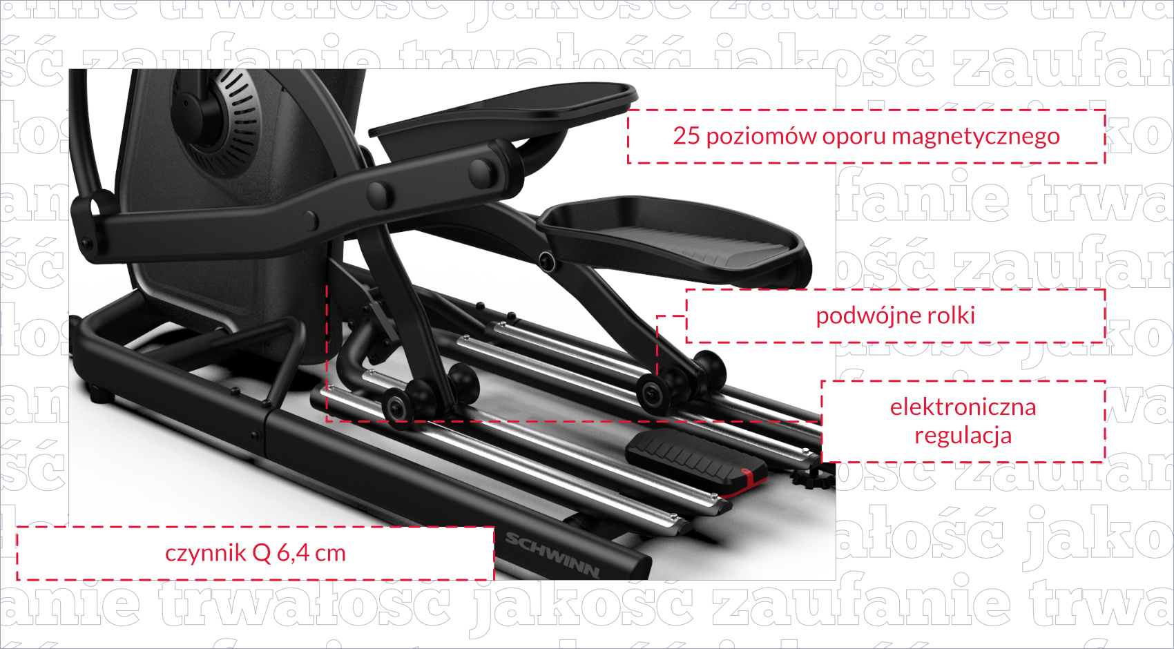 Wybierając orbitrek ważne, abyś zwrócił uwagę między innymi na współczynnik q, czyli szerokość kroku mierzona w centymetrach. Podczas treningu na rowerze eliptycznym istotne jest, aby ruch był naturalny, nie wymuszał dużego rozstawu kończyn ani rotacji miednicy. Im mniejsza szerokość kroku podczas ćwiczeń, tym lepiej. W modelu 590E wartość czynnika q to zaledwie 6,4 cm, dzięki czemu zalicza się on do zdecydowanej czołówki wśród rowerów eliptycznych.