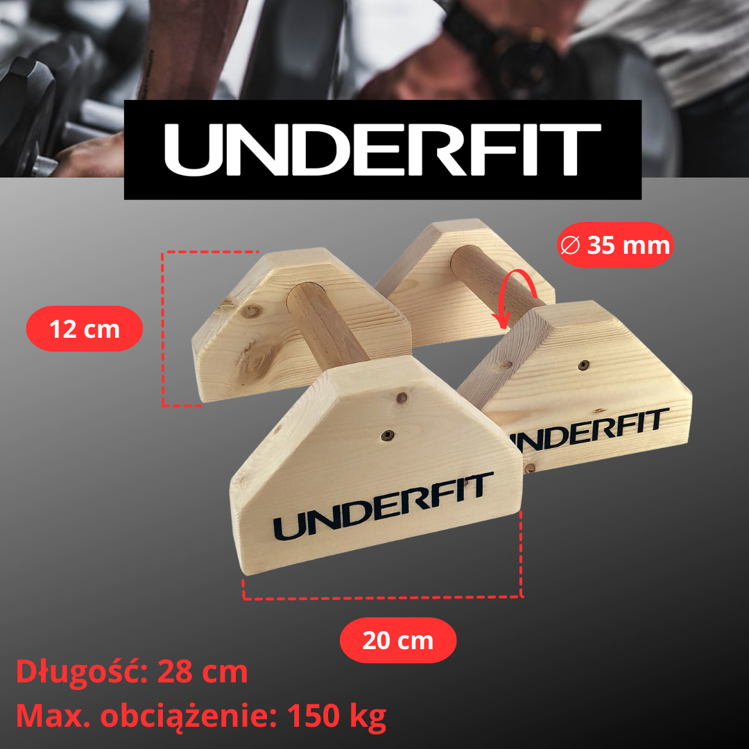 Świetnym narzędziem ułatwiającym wykonywanie pompek są paraletki UNDERFIT. Specjalne uchwyty do pompek wykonano z drewna bukowego. Budowa uchwytów paraletki, sprawia, że ciężar ćwiczącego jest rozłożony równomiernie, a nadgarstki nie są nadmiernie przeciążone. Dzięki temu, wykonywanie ćwiczeń jest wygodne i komfortowe. Jego małe, kompaktowe rozmiary umożliwiają bezproblemowe przenoszenie uchwytów np. na siłownie lub do parku. Uchwyty do pompek UNDERFIT doskonale nadają się do wykonywania pompek, dipów, w streetworkoucie lub kalistenice. Może stanowić doskonałe uzupełnienie wyposażenia siłowni lub klubu fitness.